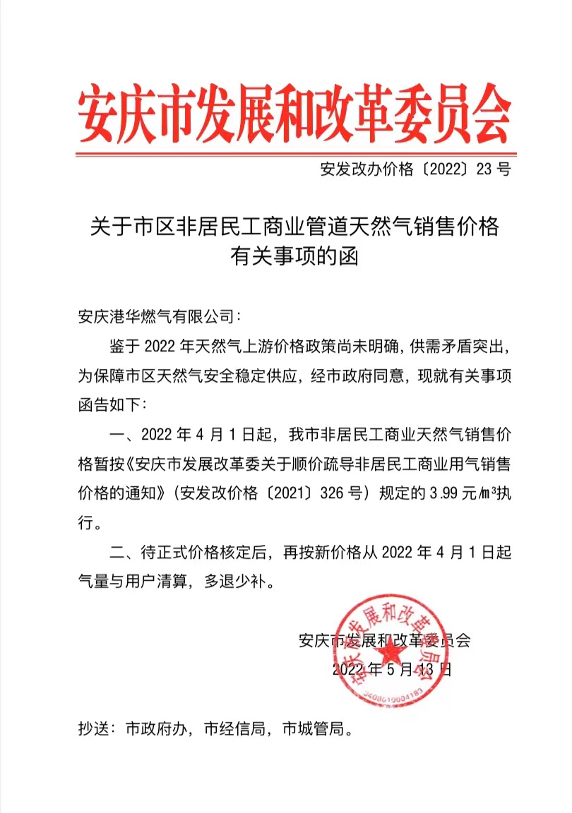 關(guān)于市區(qū)非居民工商業(yè)管道天然氣銷售價(jià)格有關(guān)事項(xiàng)的函(安發(fā)改辦價(jià)格〔2022〕23號(hào))