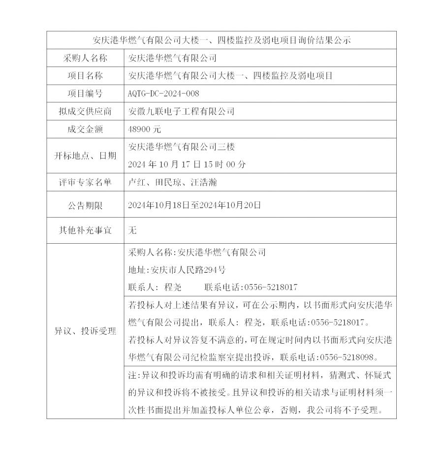 安慶港華燃?xì)庥邢薰敬髽且?、四樓監(jiān)控及弱電項目詢價結(jié)果公示