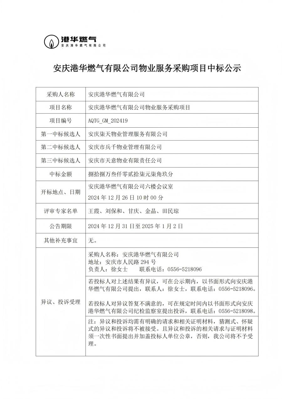 安慶港華燃?xì)庥邢薰疚飿I(yè)服務(wù)采購項(xiàng)目中標(biāo)公示