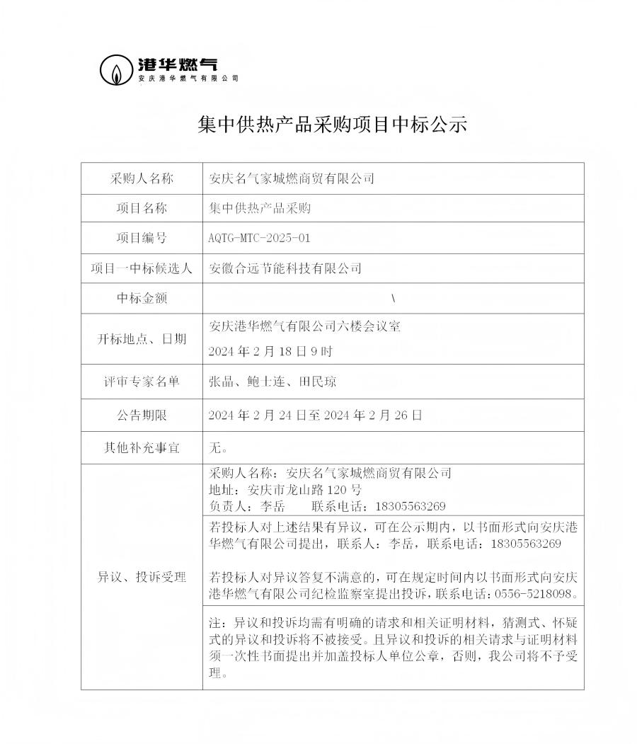集中供熱產(chǎn)品采購(gòu)項(xiàng)目中標(biāo)公示