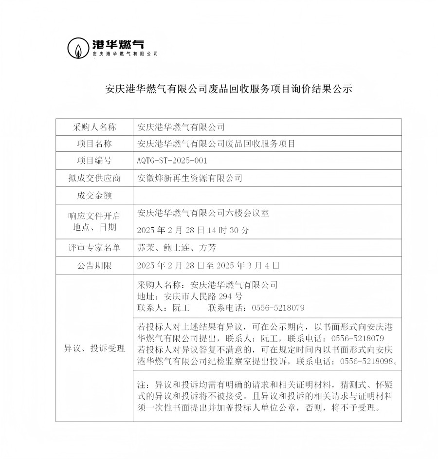 安慶港華燃?xì)庥邢薰緩U品回收服務(wù)項(xiàng)目詢價結(jié)果公示