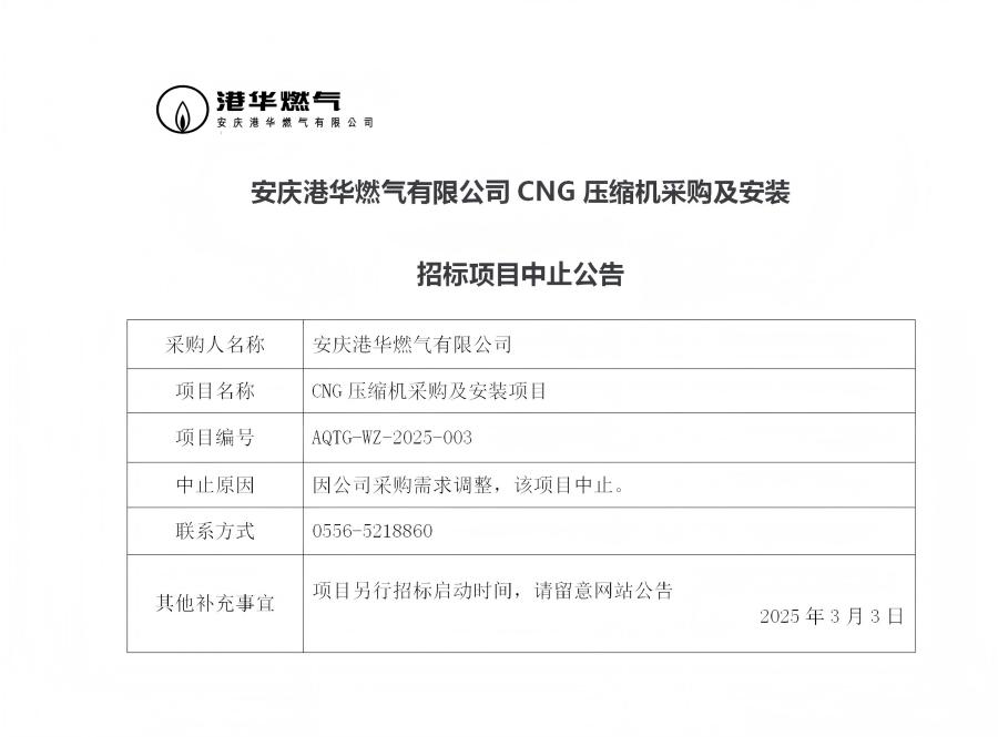 安慶港華燃?xì)庥邢薰綜NG壓縮機(jī)采購(gòu)及安裝招標(biāo)項(xiàng)目中止公告