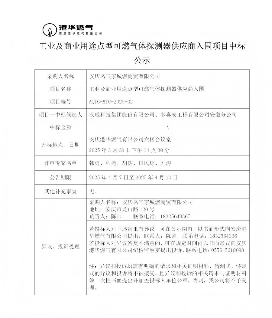工業(yè)及商業(yè)用途點型可燃氣體探測器供應商入圍項目中標公示