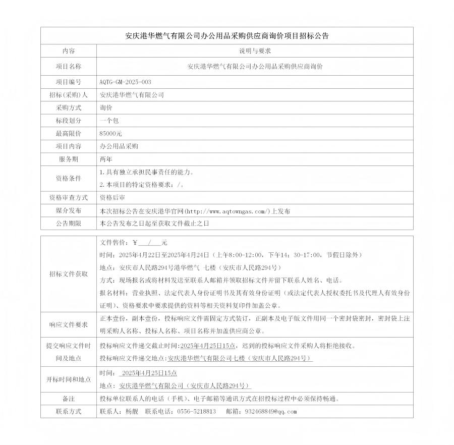 安慶港華燃?xì)庥邢薰巨k公用品采購供應(yīng)商詢價(jià)項(xiàng)目招標(biāo)公告