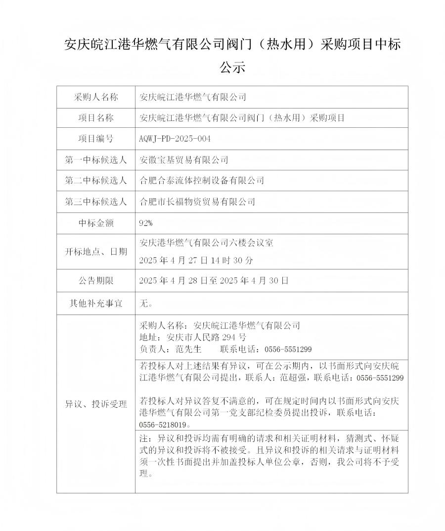 安慶皖江港華燃?xì)庥邢薰鹃y門(熱水用)采購項(xiàng)目中標(biāo)公示