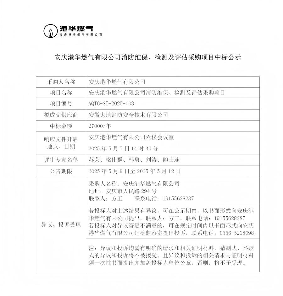 安慶港華燃?xì)庥邢薰鞠谰S保、檢測及評估采購項目中標(biāo)公示