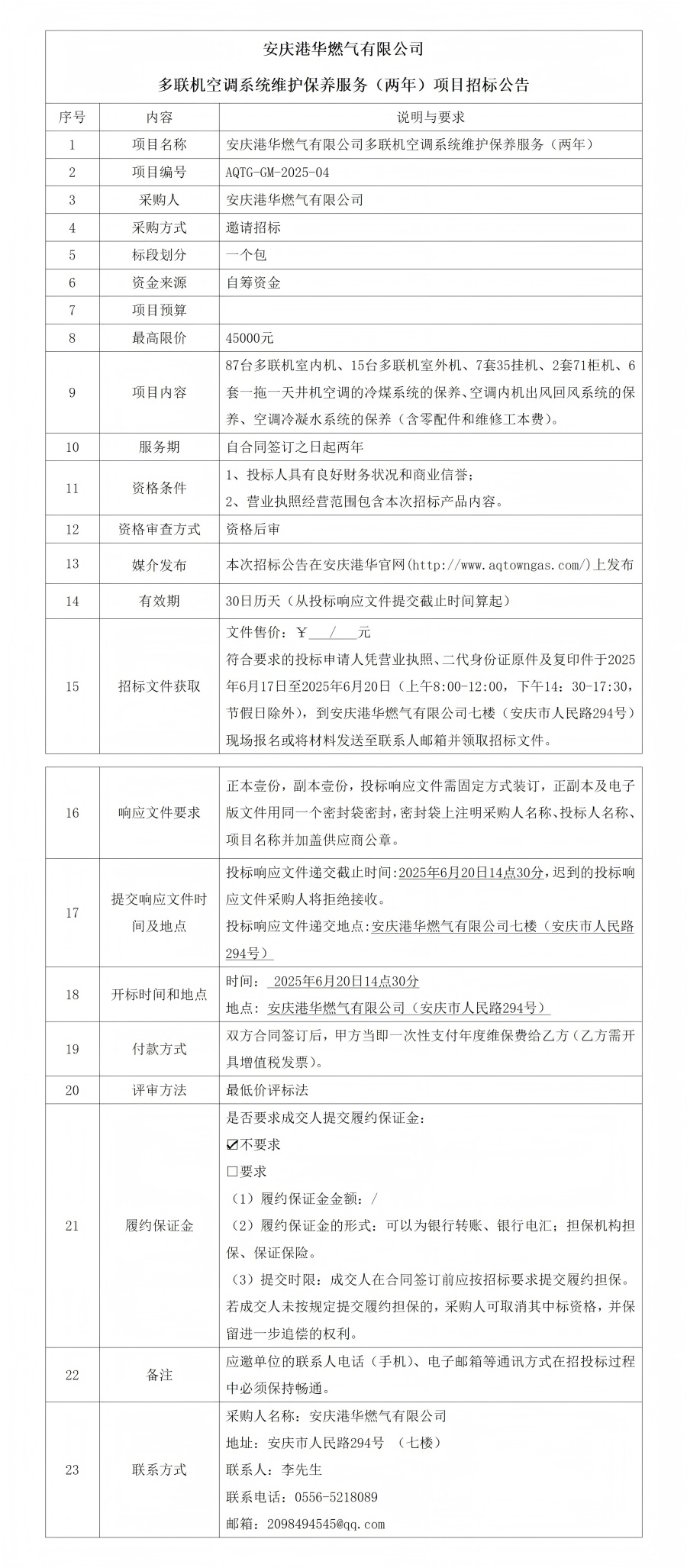 安慶港華燃?xì)庥邢薰径嗦?lián)機(jī)空調(diào)系統(tǒng)維護(hù)保養(yǎng)服務(wù)(兩年)項(xiàng)目招標(biāo)公告