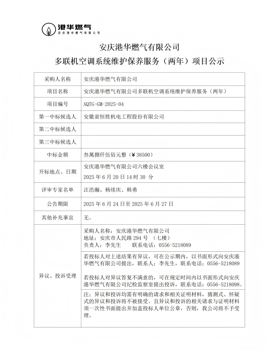 安慶港華燃?xì)庥邢薰径嗦?lián)機空調(diào)系統(tǒng)維護保養(yǎng)服務(wù)(兩年)項目公示