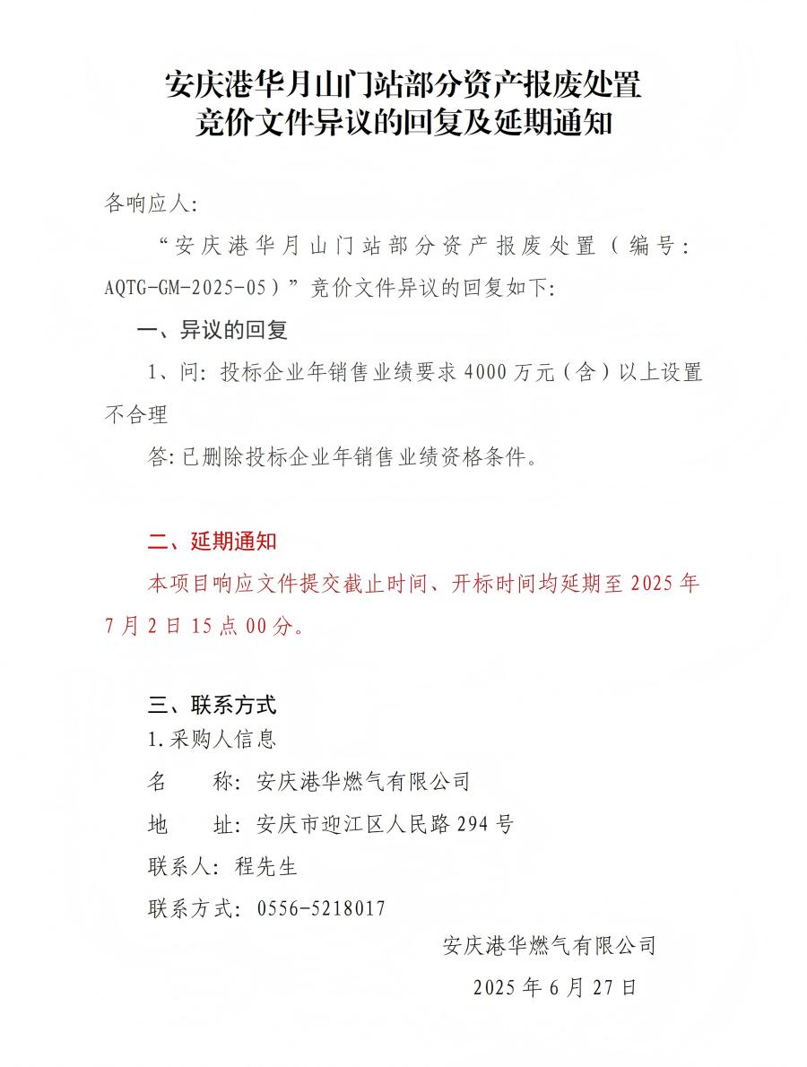 安慶港華月山門站部分資產(chǎn)報廢處置競價文件異議的回復(fù)及延期通知