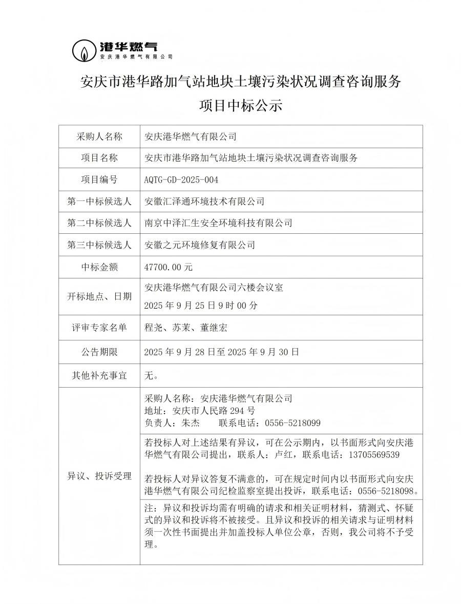 安慶市港華路加氣站地塊土壤污染狀況調查咨詢服務項目中標公示