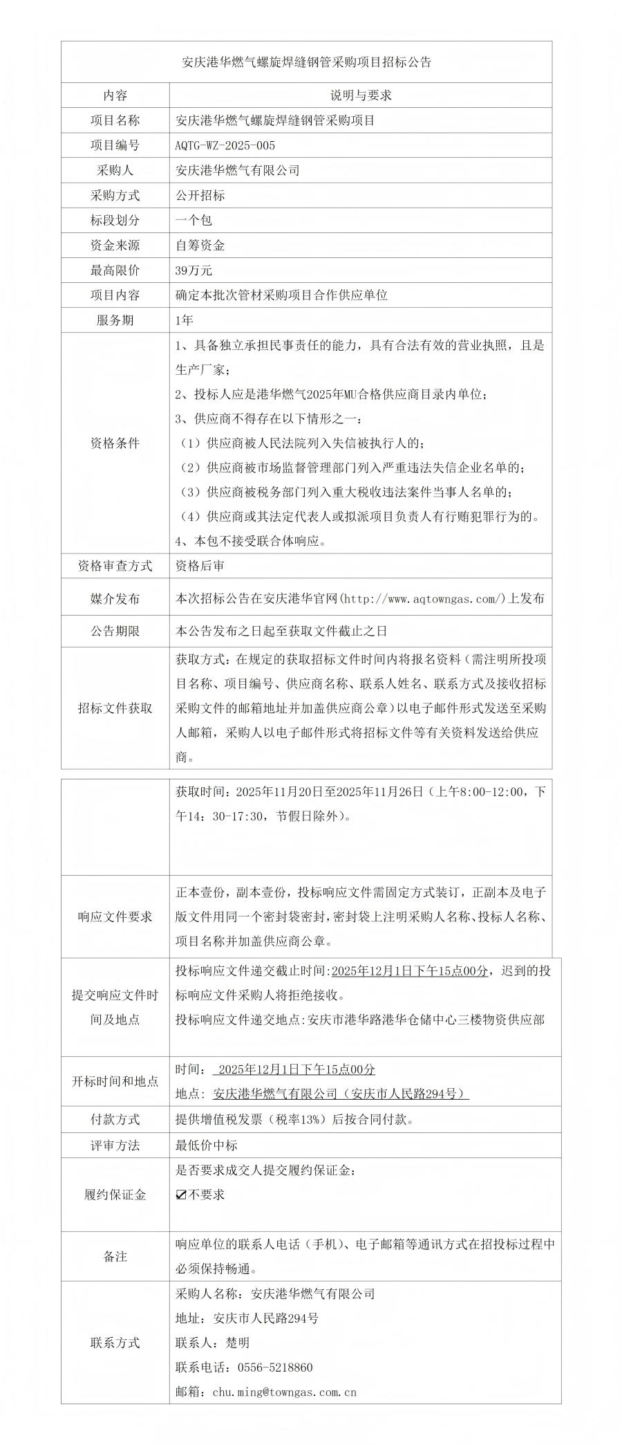 安慶港華燃?xì)饴菪缚p鋼管采購(gòu)項(xiàng)目招標(biāo)公告
