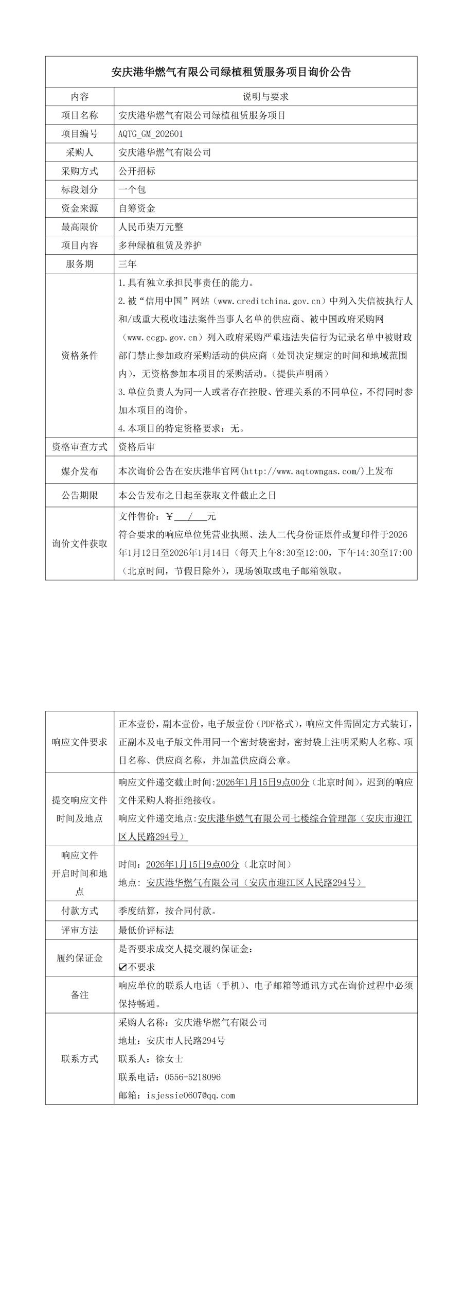 安慶港華燃?xì)庥邢薰揪G植租賃服務(wù)項目詢價公告